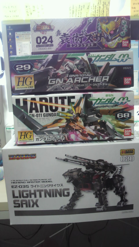 あと、コレ。貼ってなかったw 最近買ったガンプラ他――! 一番最近買ったのは、GNアーチャーとハルートかな。近所のガンプラショップにハルート買いに行こうと思ったけど、売りきれててww セールだったアーチャーを買って、ディスカウントストアのおもちゃコーナーでハルートは買いました。